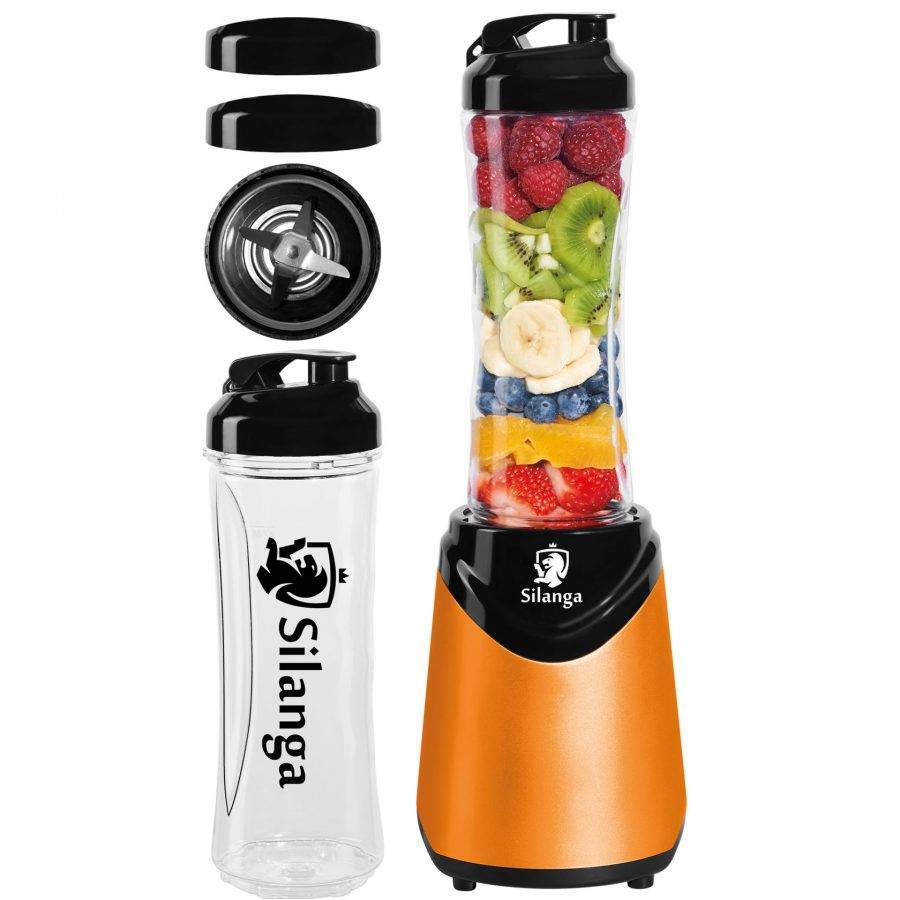 Возглавляет нашу подборку современный смузимейкер, с японским мотором мощностью 300 Вт. У него съемная чаша-шейкер, позволяющая хранить приготовленные напитки или брать с собой на спорт или прогулки. Чаша сделана из инновационного экологически чистого американского пластика Tritan, не выделяющего вредные вещества. Ее объем составляет 550 мл. Мотор достигает скорости вращения ножей до 24 тысяч оборотов в минуту. Единый скоростной режим допускает измельчение кофе, орехов или льда. Простое и безопасное использование, включающее защиту от перегрева и неправильного включения. Устройство пользуется большим спросом у покупателей.