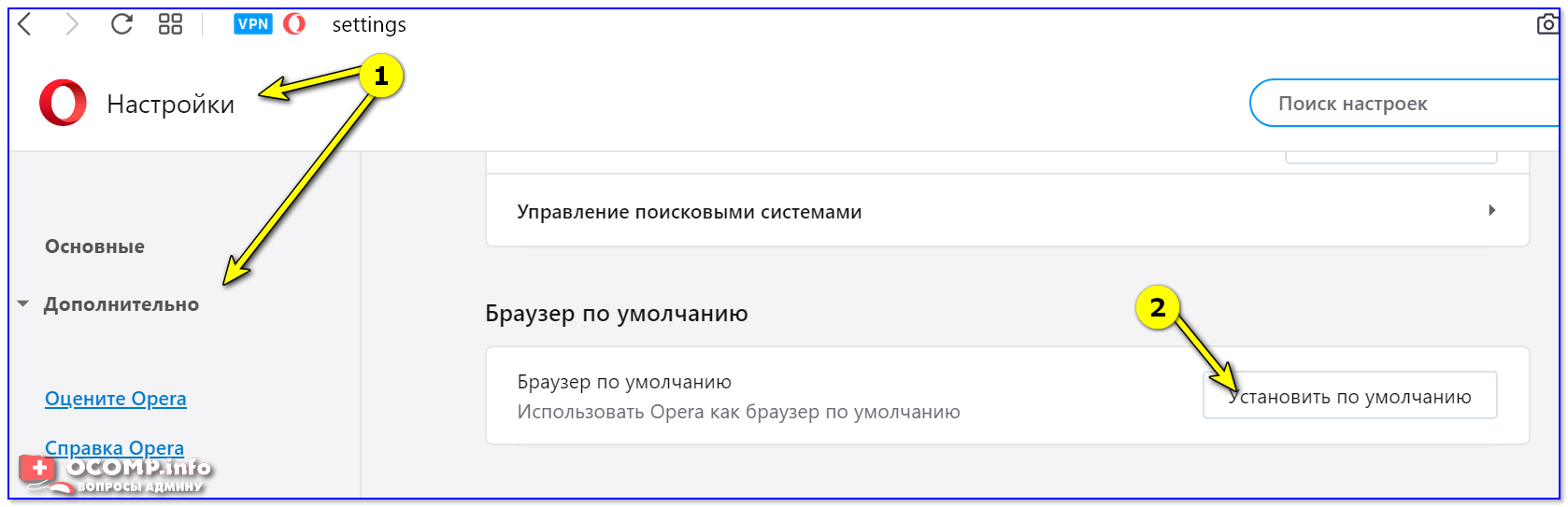 Opera. Практически аналогично вышеприведенным ПО: также нужно зайти в настройки, раскрыть вкладку «Дополнительно» и нажать по кнопке «Установить браузер основным» .