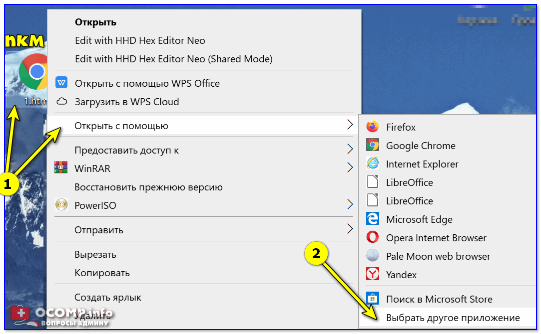 - нажать по нему правой кнопкой мыши и выбрать меню «Открыть с помощью —> Выбрать другое приложение» и указать свой браузер ();