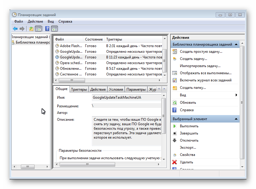 Кликните на подозрительное задание 2 раза и перейдите во вкладку «Действия», где вы сможете увидеть, какой файл запускается. Если запуск задания происходит каждые полчаса или меньше, а в некоторых случаях и чаще, то это задание необходимо удалить.