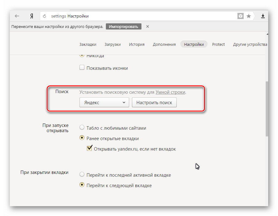 - Перейдите в настройки и выберете необходимую поисковую систему.