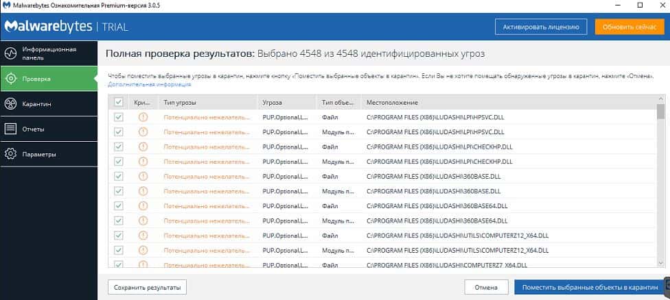 Также вы можете воспользоваться еще одной бесплатной программой, чтобы очистить компьютер от вирусов. Скачайте программу Malwarebytes и следуйте простой установке. Бесплатной версии программы сроком на 14 дней вам хватит, чтобы полностью очистить ваш компьютер от вредоносного ПО. Совершите сканирование и после нажмите на «Поместить выбранные объекты в карантин».