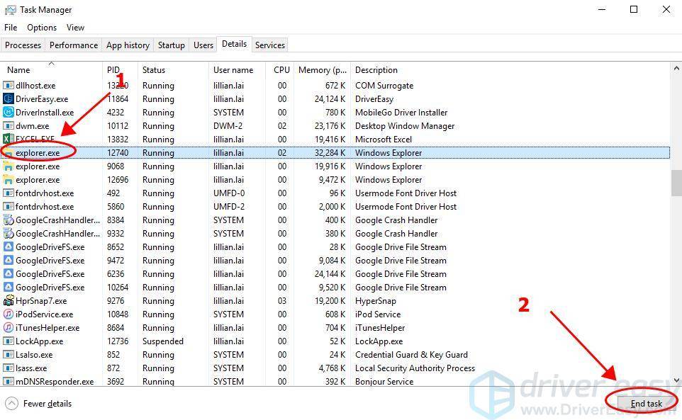 - Если да, завершите процесс, выбрав explorer.exe и нажав « Завершить задачу» .