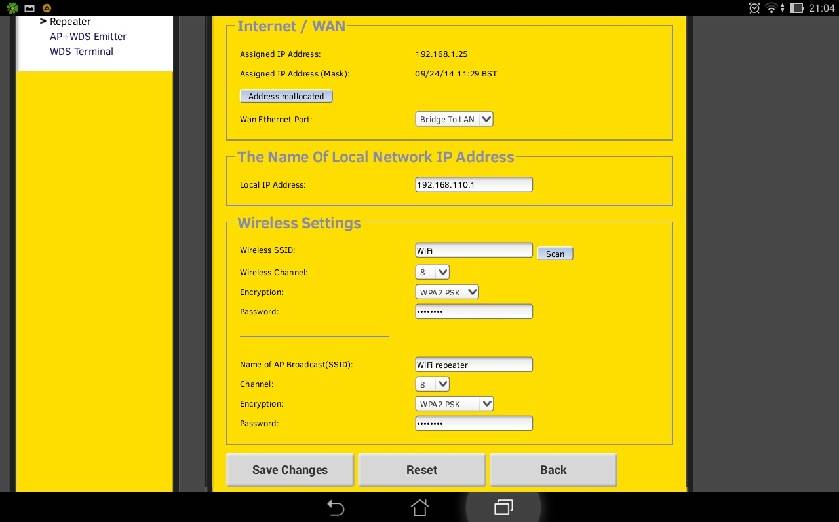 Чтобы настроить точку в режим повторителя нужно перейти в пункт RepeaterЗдесь в поле Internet/WAN мы выставляем параметр Wan Ethrnet Port: Bridge To LANдалее поле The Name Of Local IP Address тут можно задать новый IP адрес для точки, по которому мы будем ее находить из локальной сети.поле Wireless Settings самое интересное: