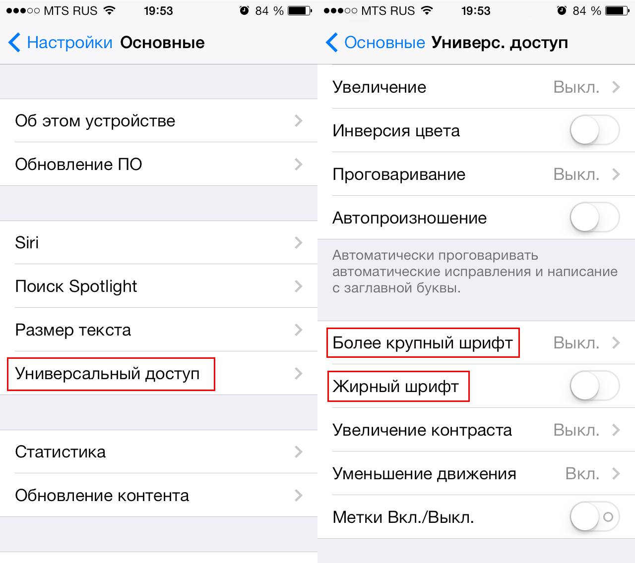 - Активация жирного шрифта. Смена стандартного шрифта на «потолще» также повлечёт за собой перезагрузку устройства. Нужно всего лишь зайти в раздел «настройки». Оттуда перейти в подраздел «универсальный доступ». Здесь вы увидите строку «жирный шрифт», а справа от неё будет слайдер активации.