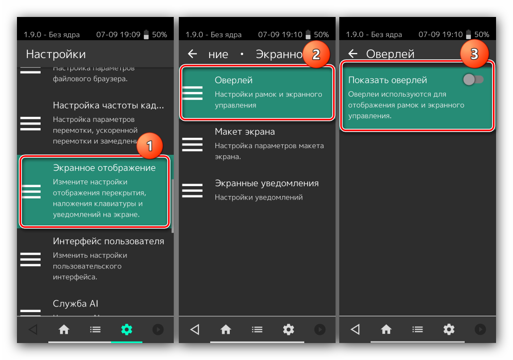 Для отключения виртуального геймпада перейдите по пунктам «Настройки» – «Экранное отображение» – «Оверлей» и задействуйте переключатель «Показать оверлей».