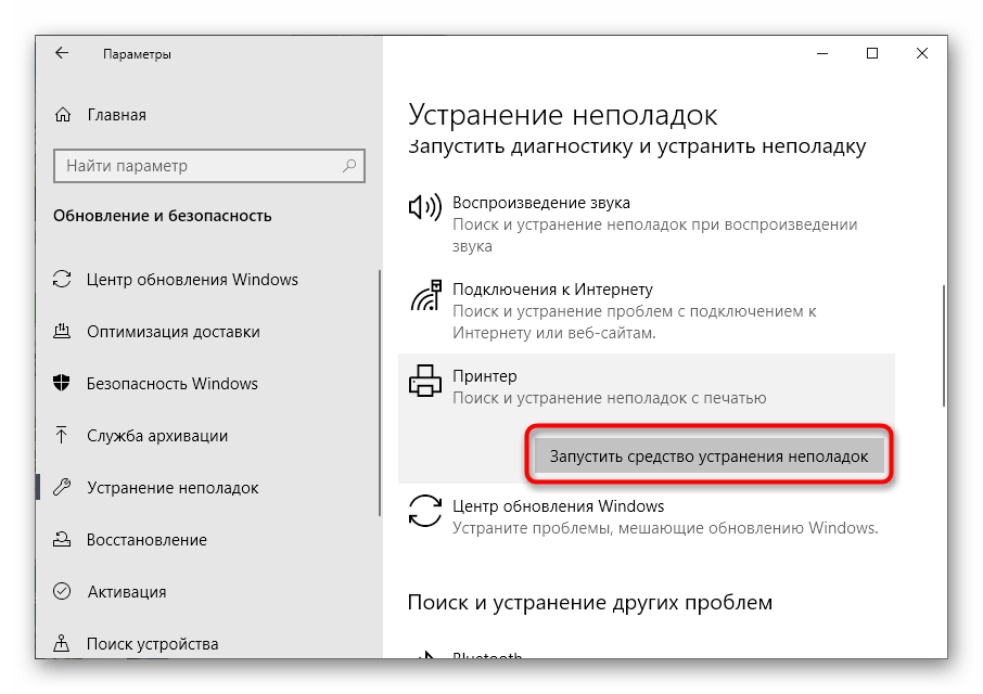 Большинство незначительных проблем или неправильных настроек, которые могут вызвать сложности с печатью на принтере Brother, можно решить непосредственно в Windows при помощи встроенного средства устранения неполадок. Обязательно запустите приложение при подключенном принтере, чтобы инструмент смог его распознать и выполнить диагностику.