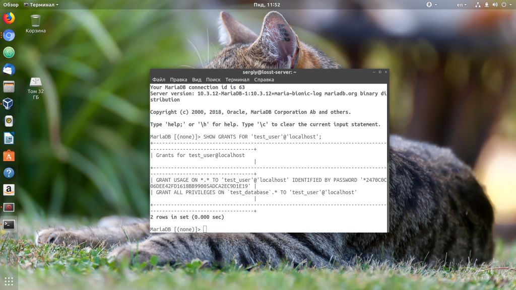 Даём все привилегии для пользователя test_user над всеми базами данными и всеми таблицами. Но наш пользователь не сможет давать права другим пользователям. Чтобы это исправить, нужно дать ему привилегию GRANT, а для этого используется такая команда: