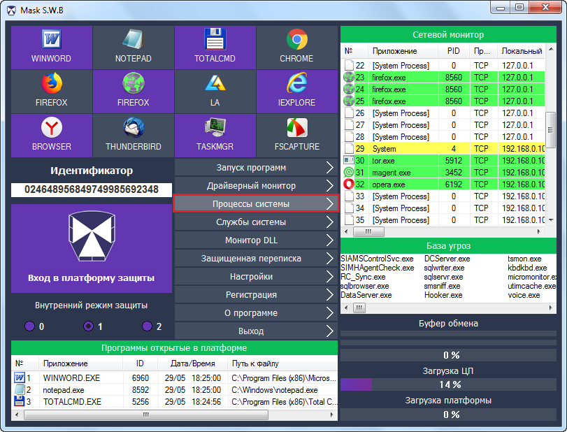 С помощью антишпиона Mask S.W.B Pro, можно защищаться от компьютерных шпионов и различных методов слежения, не удаляя их с компьютера. Если, по какой-либо причине Вы не вправе или не хотите удалять шпиона со своего компьютера, но при этом нужно скрыть (замаскировать) свои действия, обманывая следящего. Заходите в защищённую среду Mask S.W.B Pro нажав в главном окне большую кнопку с логотипом программы и надписью “Вход в платформу защиты”. Все ваши действия, которые будут производиться в защищённой среде, шпион Windows Spy Keylogger не сможет, перехватить, увидеть и соответственно сохранить в своём логе. Злоумышленник будет думать, что на компьютере никто не работал.