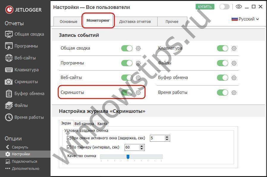 Вторая вкладка «Мониторинг» предназначена для настройки отдельных типов отслеживаемых данных – снимков экрана и с веб-камеры, используемых программ, посещаемых сайтов, оперируемых файлов и пр. Любой из типов отслеживаемых данных можно отключить, если он не представляет интерес или поглощает чрезмерно много системных ресурсов. Некоторые типы отслеживаемых данных настраиваются дополнительно. Так, для снимков с веб-камеры и скриншотов можно изменить условия их создания. Последние, в зависимости от возможностей компьютера, могут создаваться в худшем или лучшем качестве. Хранилище снимков можно ограничить определенным объемом занимаемого места на диске.