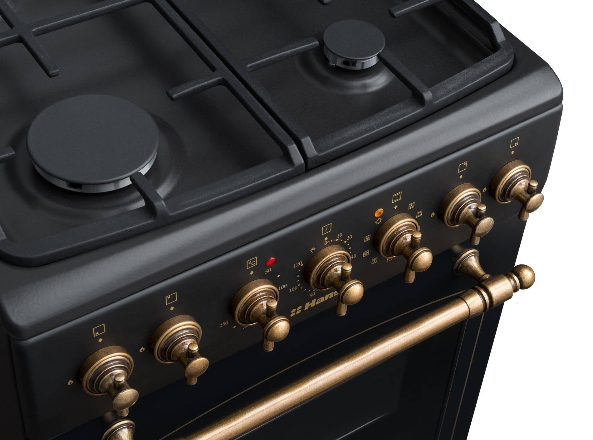 Варочная поверхность этой модели оснащена двумя электрическими тэнами и двумя газовыми горелками. Решетки над конфорками выполнены из чугуна. Модель имеет большую духовку на 70 л. Безопасность варки обеспечивает опция «газконтроль».
