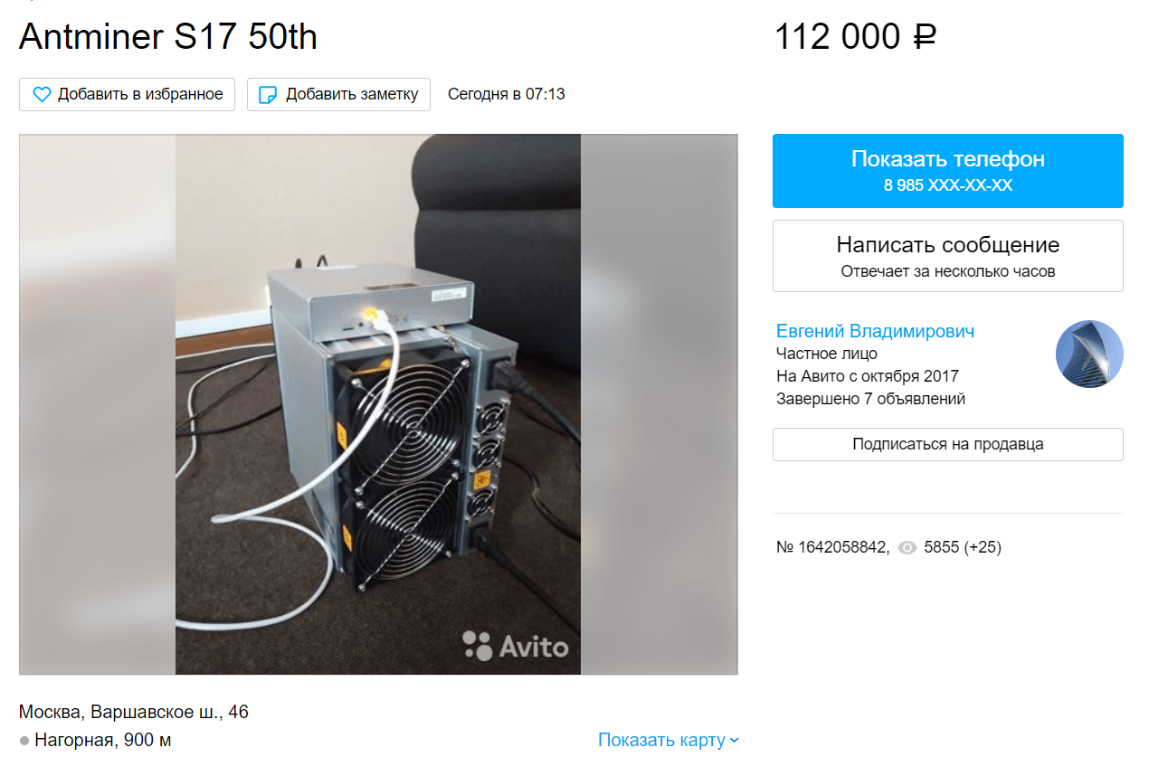 Для майнинга Bitcoin используют ASIC — специальные устройства, которые кроме добычи BTC больше ничего делать не могут. Самый эффективный ASIC на данный момент, который есть в свободной продаже, это Antminer S17 Pro. Недавно Bitmain представила S19 и S19 Pro, но их пока не продают. По данным Авито, его цена варьируется от 110 до 130 тысяч рублей вместе с блоком питания. Мы нашли тонну объявлений по продаже: посмотрите для примера это и ещё одно объявление.