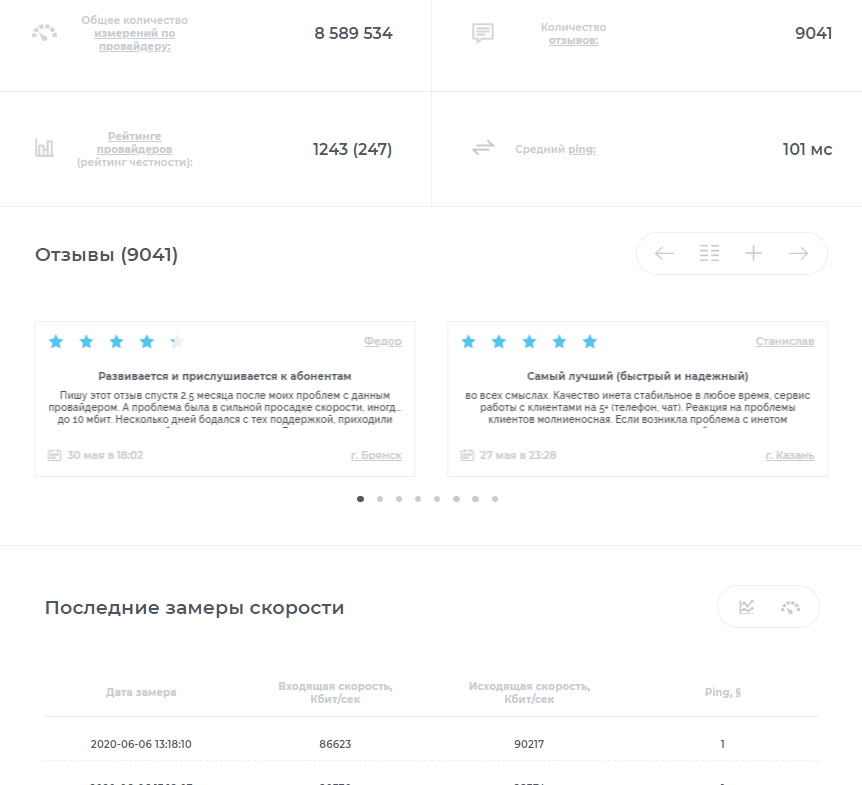 В карточке вы найдете контакты провайдера, отзывы о его работе, ответы представителей компании. Оценить качество соединения поможет наш сервис, где вы узнаете показатели скорости по каждому провайдеру, а также средний ping (время отклика страниц). Результаты последних десяти замеров выведены в отдельный блок и постоянно обновляются.