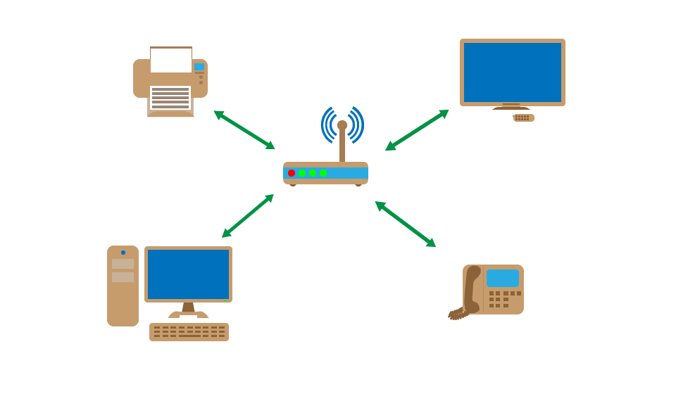 - LAN – маленькая сеть для дома или рабочего помещения. Для связи между офисами в разных городах существует VLAN (Virtual Local Area Networks). Эта технология связывает удалённые узлы и позволяет им пользоваться общими сетевыми устройствами, например, принтером или файловым хранилищем так, как будто они находятся в одном офисе.