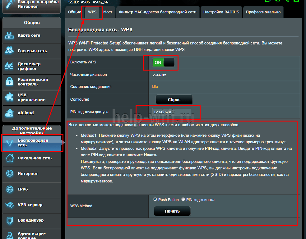 Чтобы раскрыть меню с настройками WPS для сетевого устройства «Асус», сделайте следующее: