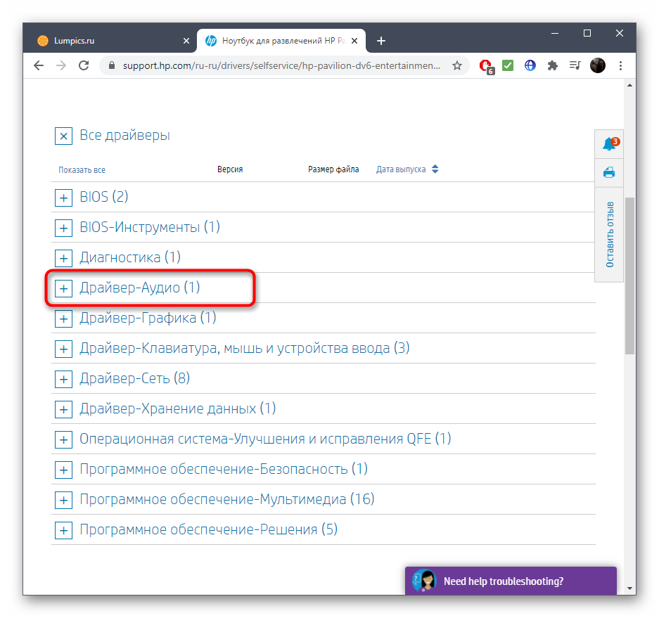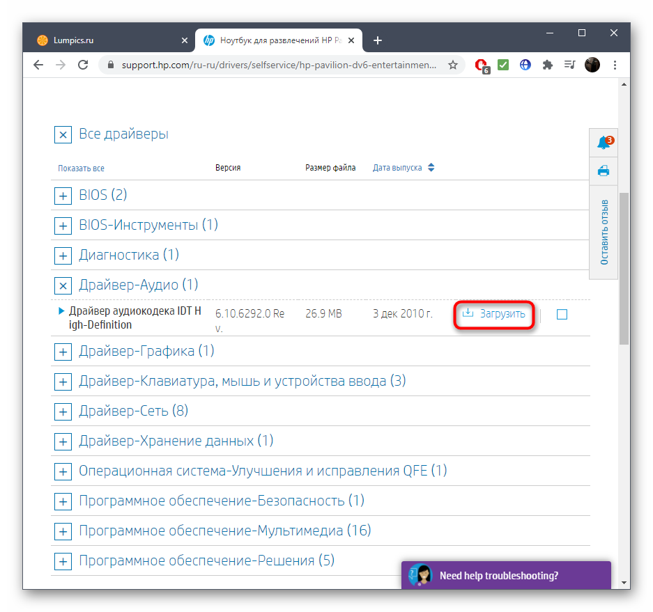 - Воспользуйтесь поиском в браузере, чтобы отыскать страницу используемого девайса, и в разделе с драйверами найдите файлы для аудио.