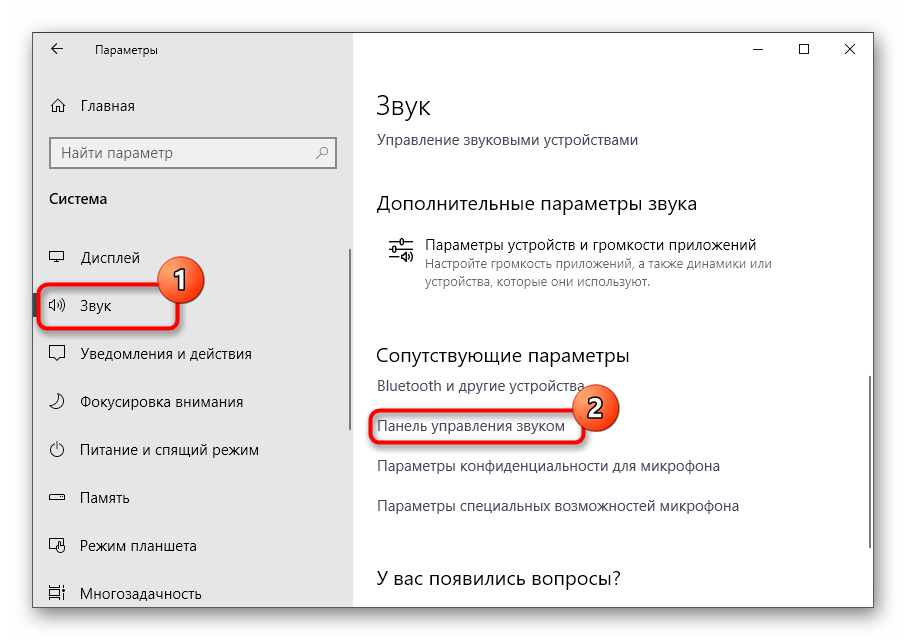 Перейдите к категории «Звук», опуститесь к блоку «Сопутствующие параметры» и нажмите по кликабельной надписи «Панель управления звуком».