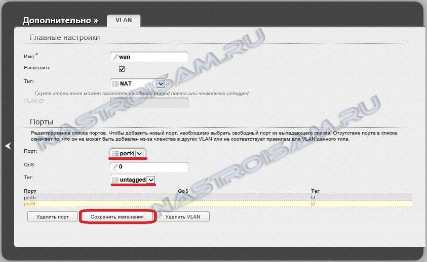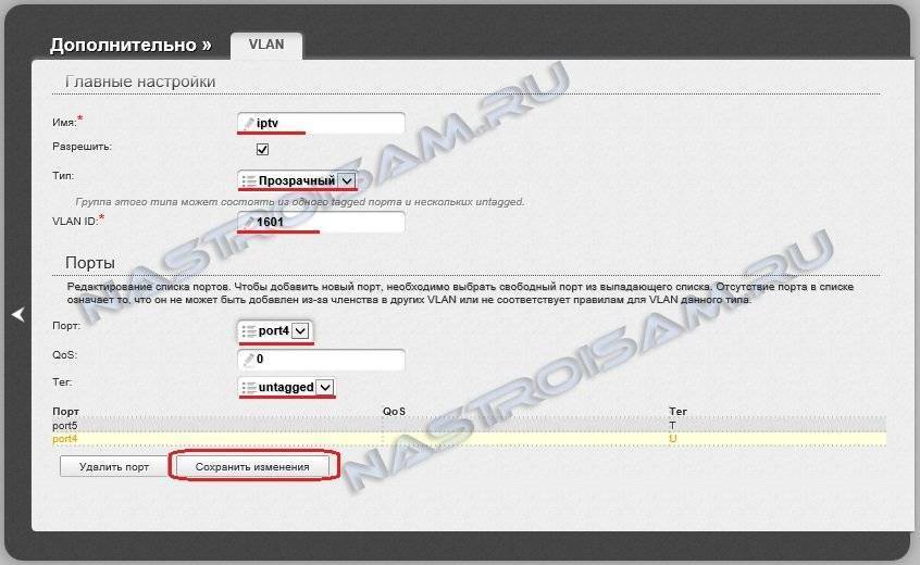 Здесь в поле Порт выбираем выделенный под STB-приставку 4-й порт, в поле Тег ставим значение untagged. Нажимаем кнопку Сохранить изменения. В результате в таблице VLAN должно получиться так: