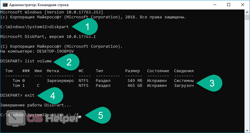 - list volume (программа покажет, какая буква была назначен на неисправный раздел диска, поскольку она может отличаться от той, что была установлена в системе);