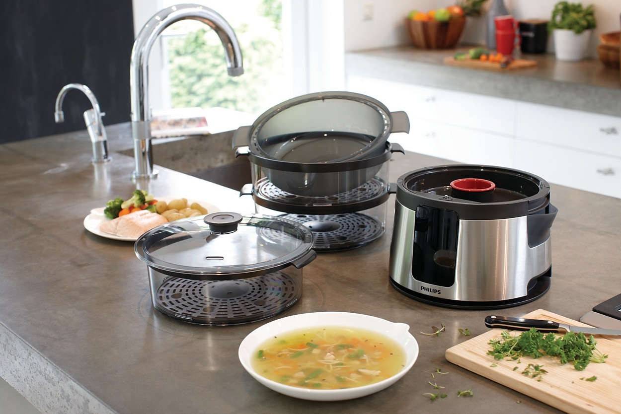 Однако при этом важно подобрать оптимальное соотношение мощности и количества чаш (неплохо бы ещё и объём каждой чаши учесть). К примеру, 900-ваттная пароварка будет прекрасно работать с тремя 3-литровыми чашами.