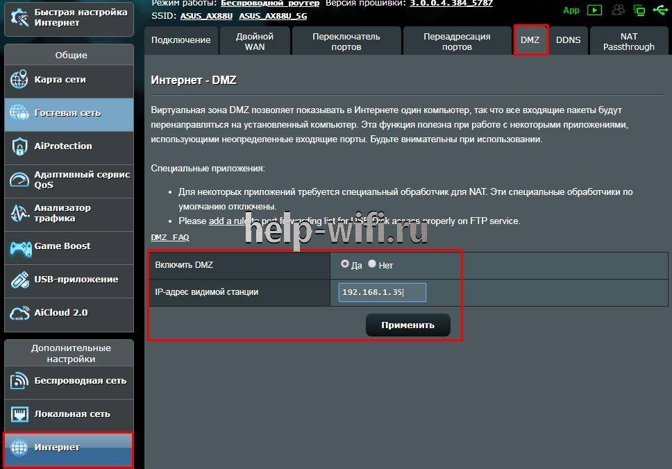 Зайдите в интерфейс маршрутизатора и в административной панели отыщите вкладку с названием DMZ. Например, у сетевых устройств от компании ASUS данная вкладка расположена в «Интернет» -> «DMZ».