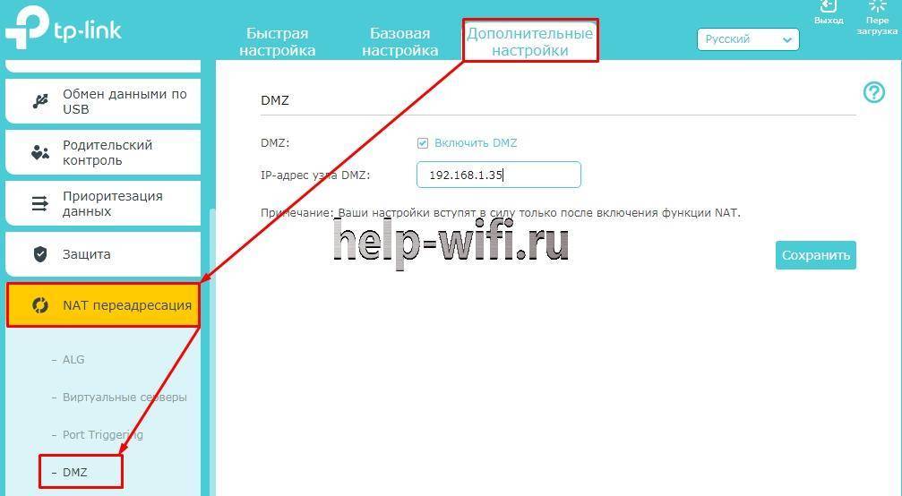 Функция DMZ на роутере TP-Link в новой версии веб-интерфейса находится в «Дополнительных настройках» в разделе «NAT переадресация — DMZ». Здесь все просто — включаем его галочкой и указываем IP адрес компьютера, на котором откроются все порты.