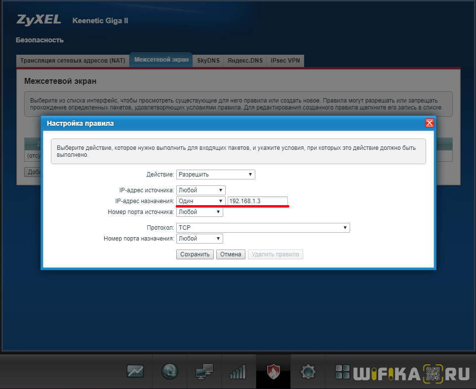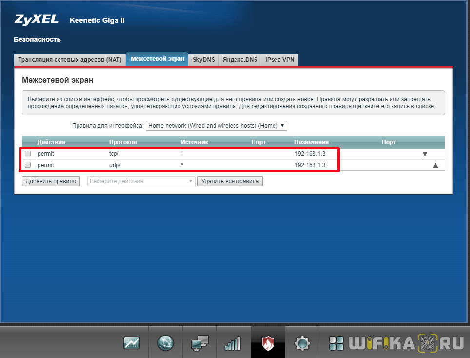 NOTE: Важно! Дополнительную настройку межсетевого экрана производить не нужно, т.к. при использовании правила переадресации интернет-центр самостоятельно открывает доступ по указанным портам и протоколам. Если переадресация портов по какой-то причине не заработала, обратитесь к статье «Что делать, если не работает переадресация портов?»