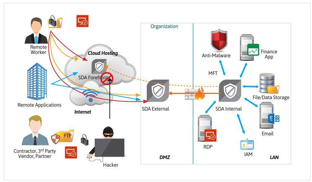Роль внешнего сервера, расположенного в DMZ организации (на месте или в облаке), заключается в поддержании клиентской стороны пользовательского интерфейса (фронтенда, front-end) к различным сервисам и приложениям, находящимися во Всемирной сети. Он функционирует без необходимости открытия каких-либо портов во внутреннем брандмауэре и гарантирует, что во внутреннюю локальную сеть могут попасть только легитимные данные сеанса. Внешний сервер выполняет разгрузку TCP, позволяя поддерживать работу с любым приложением на основе TCP без необходимости расшифровывать данные трафика криптографического протокола SSL (Secure Sockets Layer, уровень защищенных cокетов).
