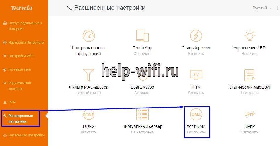 Активация DMZ хоста на wifi роутере Tenda находится в «Дополнительных настройках». Здесь все просто — переводим тумблер во включенное положение и вписываем IP адрес компьютера или иного устройства, на котором мы хотим открыть все порты