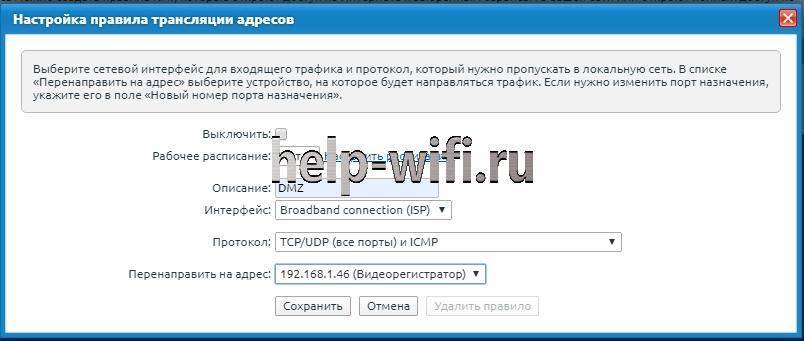 Приведу пример — часто при подключении регистратора видеонаблюдения по умолчанию используется порт 80 и поменять его в настройках просто невозможно. В то же самое время на маршрутизаторе этот порт также занят и перенаправить его не получится. В этом случае на помощь приходит DMZ-хост на роутере.
