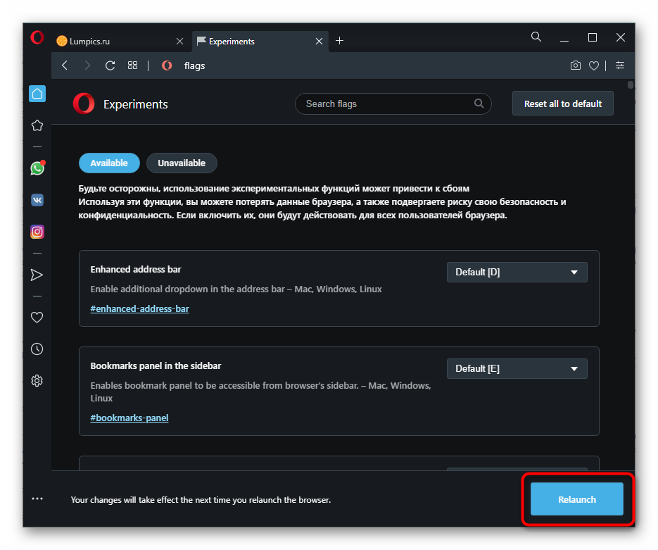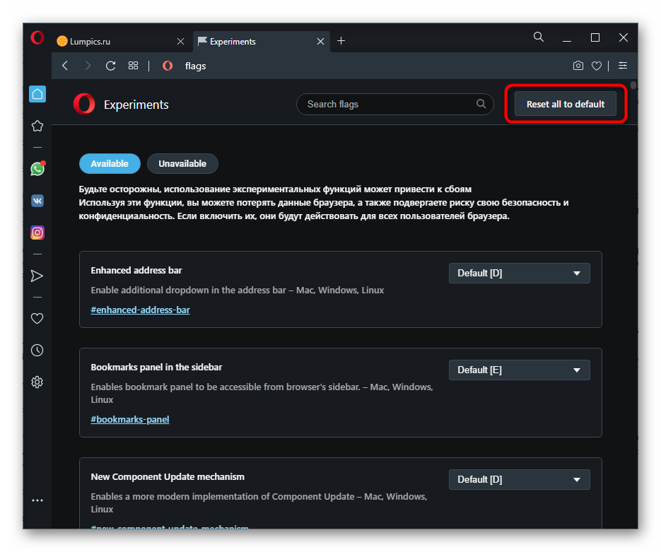 Некоторые пользователи решают более тонко настроить браузер, переходя в раздел с экспериментальными параметрами. Однако бездумный или просто неправильный выбор хотя бы одного значения может привести в лучшем случае к ошибкам и тормозам, а в худшем — к невозможности даже открыть программу. Если вы не так давно заходили в раздел с экспериментальными настройками и что-то там меняли, сбросьте их к состоянию «По умолчанию».