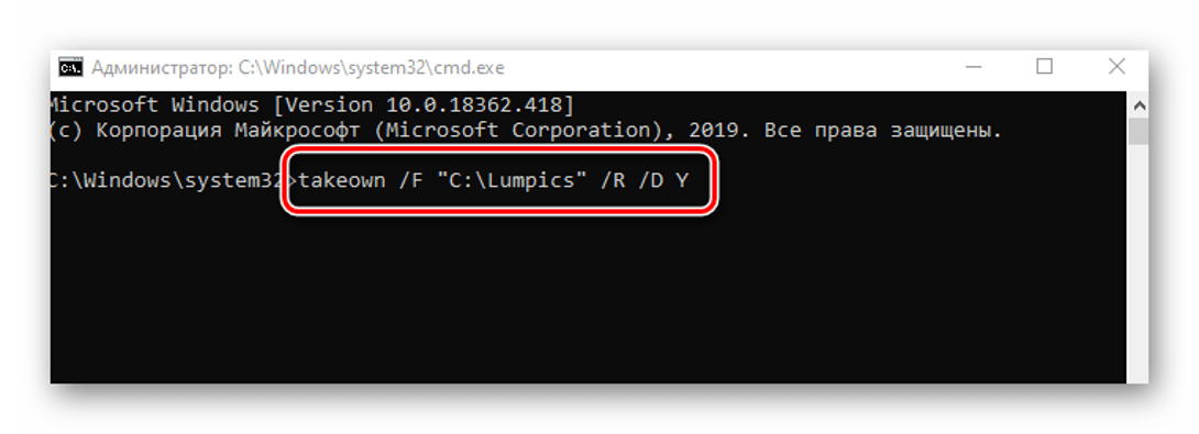- В открывшемся окне набрать команду: «takeown /F “C:\Folder\Lumpics” /R /D Y», где указать полный путь к файлу или папке вместо надписи в кавычках.