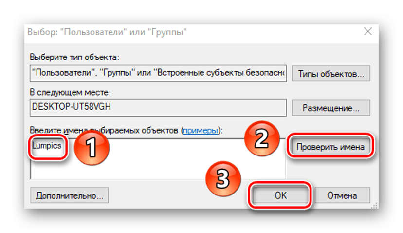 - Вписать в строку логин пользователя, нажать кнопку «Проверить имена». При вводе данных нужно учитывать, что невозможно переместить сюда учетку, если пользователь не использовал верхние и нижние регистры. При правильном вводе информации система найдет и добавит запись.
