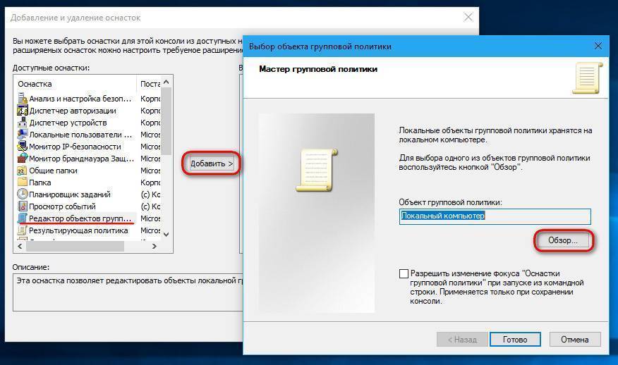 Кликаем «Редактор объектов групповой политики». Нажимаем «Добавить», затем – «Обзор».