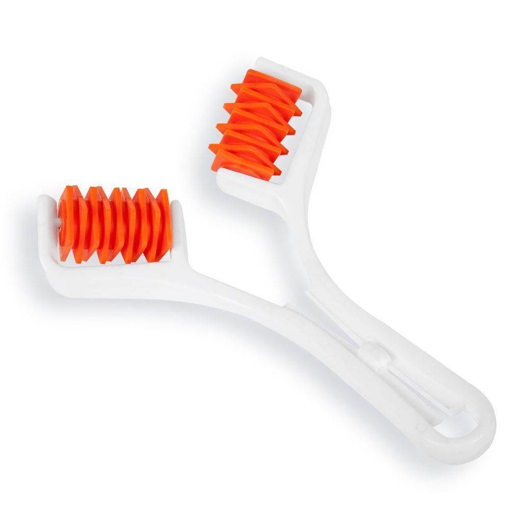 Роликовый элемент включает небольшие колючие кольца из прочного пластика, весит всего 72 г при размерах 9x18x3 см. Эргономику ручки создают рельефные элементы, благодаря чему она не скользит в руке.