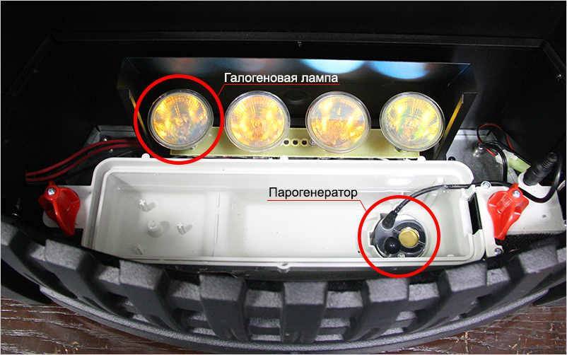 В зависимости от модели электрокаминов с парогенератором, в них может быть установлено различное количество галогенных ламп. Интенсивность подсветки напрямую связана с яркостью пламени, которое иногда можно увидеть даже при ослепительном свете. Но электрокамин с увлажнителем воздуха раскрывает все свои возможности в темноте или полумраке.