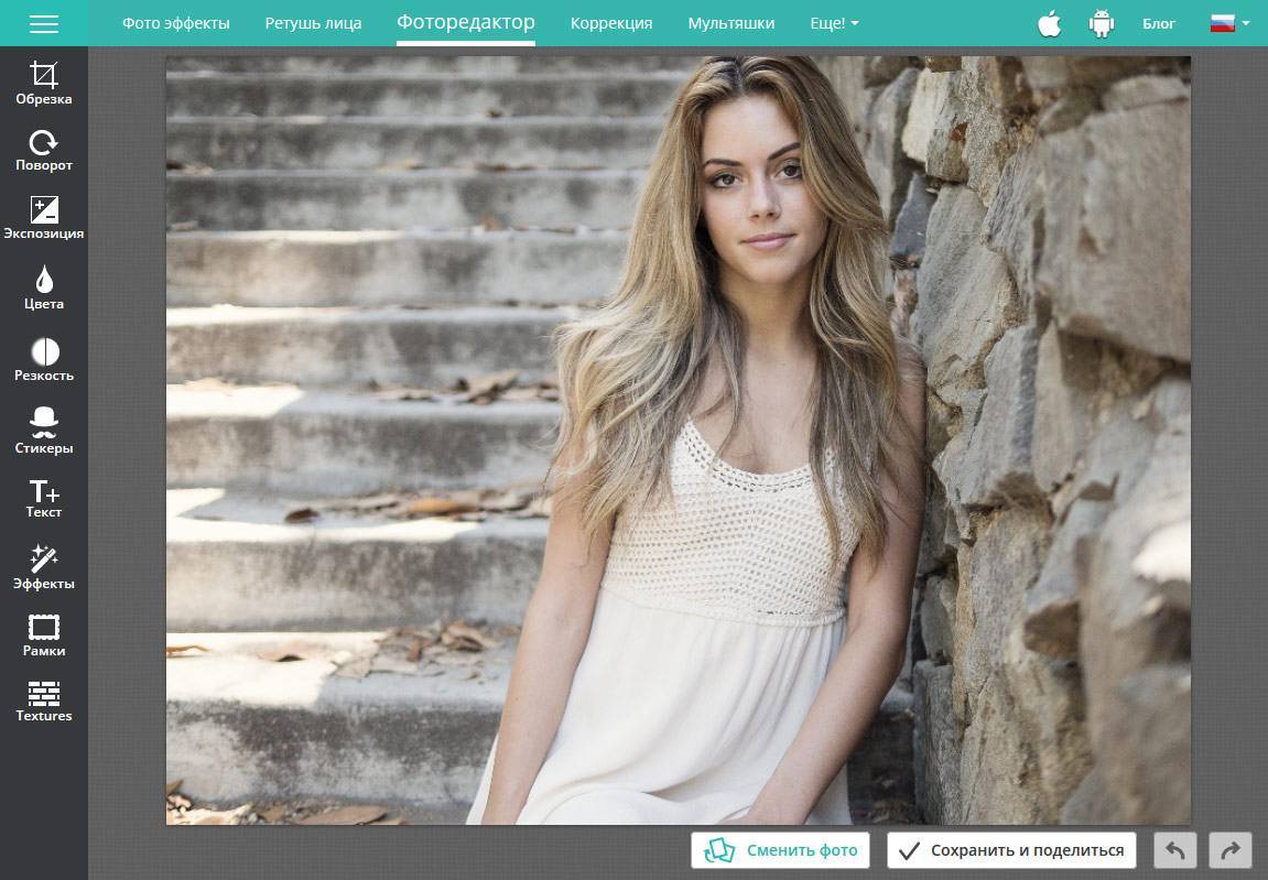Нужная кнопка – редактировать фото – прямо в центре. Все кнопки выстроены в удобном порядке, обработка работает быстро, результат виден сразу. В настройках цвета – 15 инструментов. Есть где разгуляться фанатам фильтров и эффектов – их в программе больше 500. Рамок на этом ресурсе тоже 30. Скрыть недостатки кожи поможет ретушь – сделать белоснежной улыбку, убрать сыпь, красные глаза, сгладить неровности. Можно подправить фокус, выделить отдельные элементы цветом. Работают поворот, отражение, выравнивание, изменение размера.