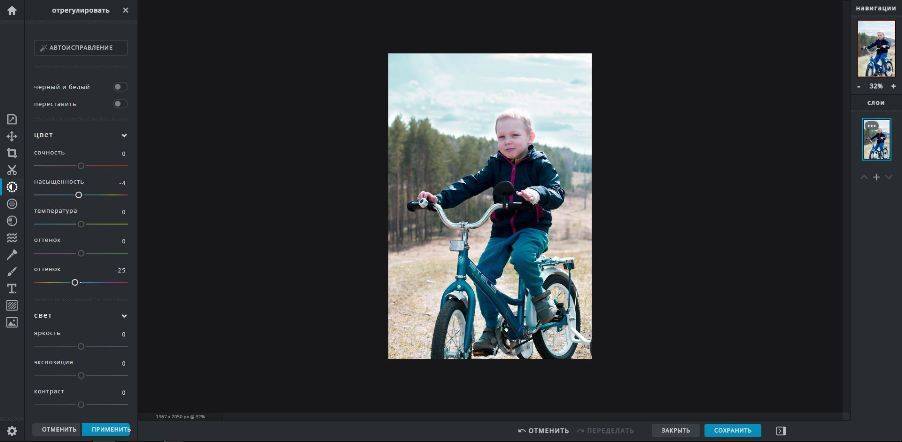 Онлайн-приложение, в котором можно быстро настроить цветность фото, подтянуть или убавить яркость, собрать из нескольких изображений коллаж или наоборот – вырезать отдельную картинку из коллажа. В базовой версии доступны ручные настройки цветокоррекции и опции для обрезки и изменения разрешения изображения. Всё остальное – замена фона, точечная ретушь, превращение фотографии в картину маслом, коллажирование – в платной расширенной.