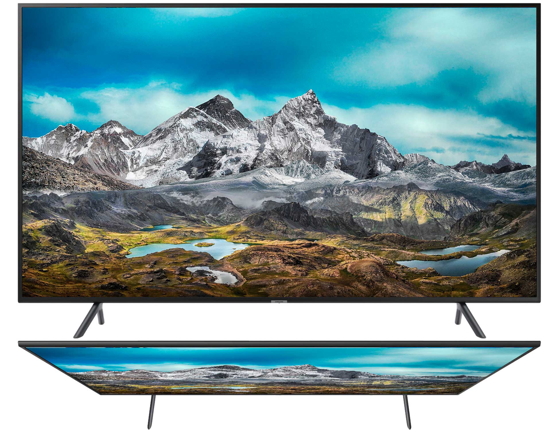 Samsung UE43RU7400U 43″ (2019). Диагональ экрана 43 дюйма, мощность звука чуть ниже, 20 Вт, также имеются все возможные разъемы.