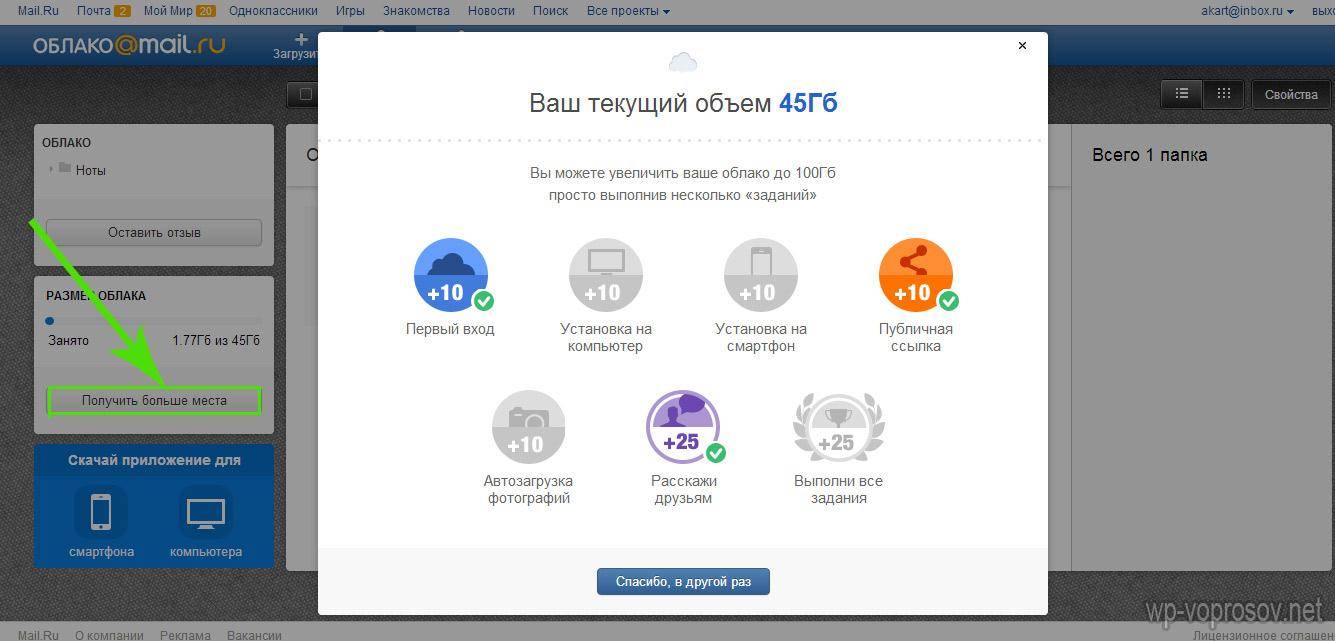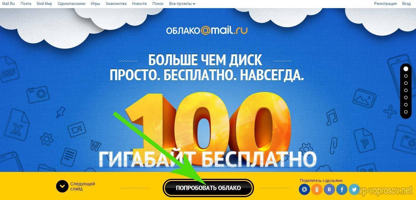 Данный сервис появился совсем недавно — буквально на днях я его увидел и тогда то и мне пришла в голову мысль написать эту статью. Для того, чтобы его завести, нужно сначала зарегистрироваться в почте от Mail.Ru. Изначально дается 10 ГБ места, которое можно увеличить аж до 100 гигов путем совершения нескольких простых действий.