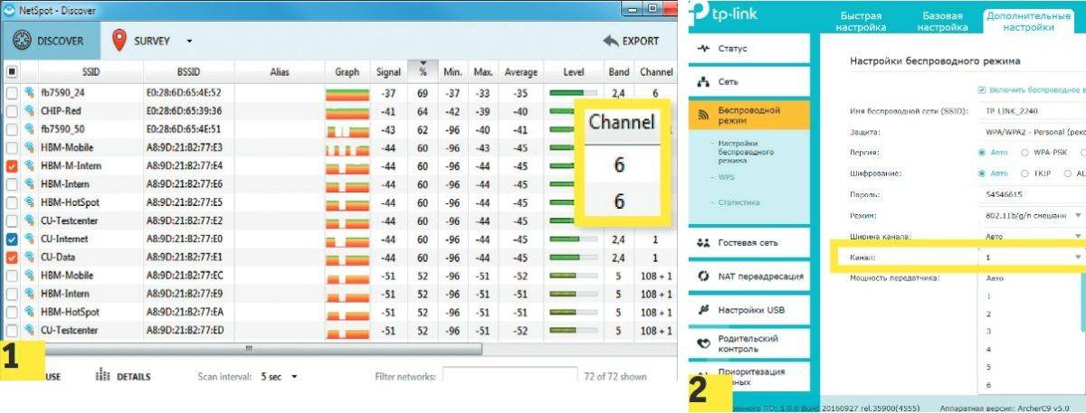 NetSpot (1) показывает, что вторая беспроводная сеть перекрывает первую (которая нам нужна) и работает на том же шестом канале. Поэтому в настройках роутера (2) мы устанавливаем канал 1, потому что он расположен далеко от самого сильного мешающего сигнала