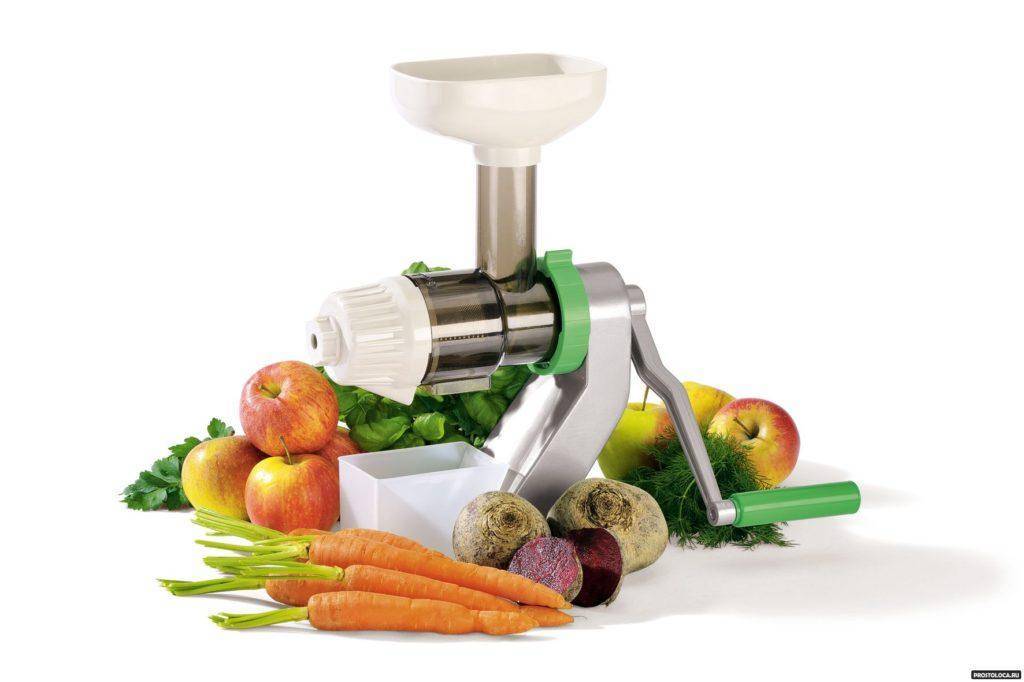 Основная позитивная отличительная черта таких соковыжималок – низкая цена. Принцип их работы механический – вращение ручки приводит в движение шнек, который размалывает растительный компонент. Существенный недостаток такого варианта – необходимость приложения достаточно значительных усилий, притом, что рука достаточно быстро устает (особенно на плотных твердых продуктах).