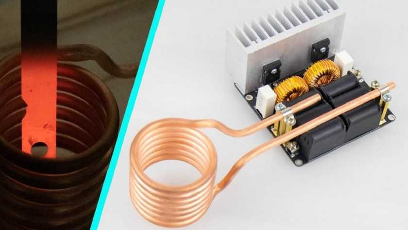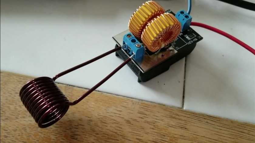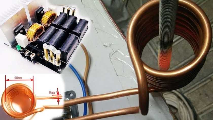 Индукционная катушка нагревает металл (трубу или куски проволоки), помещенные внутри нее, с помощью высокочастотных вихревых токов, контакт не обязателен