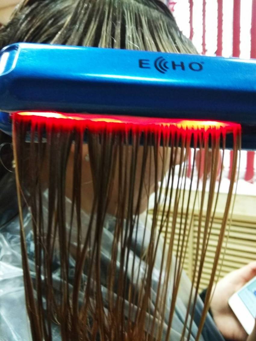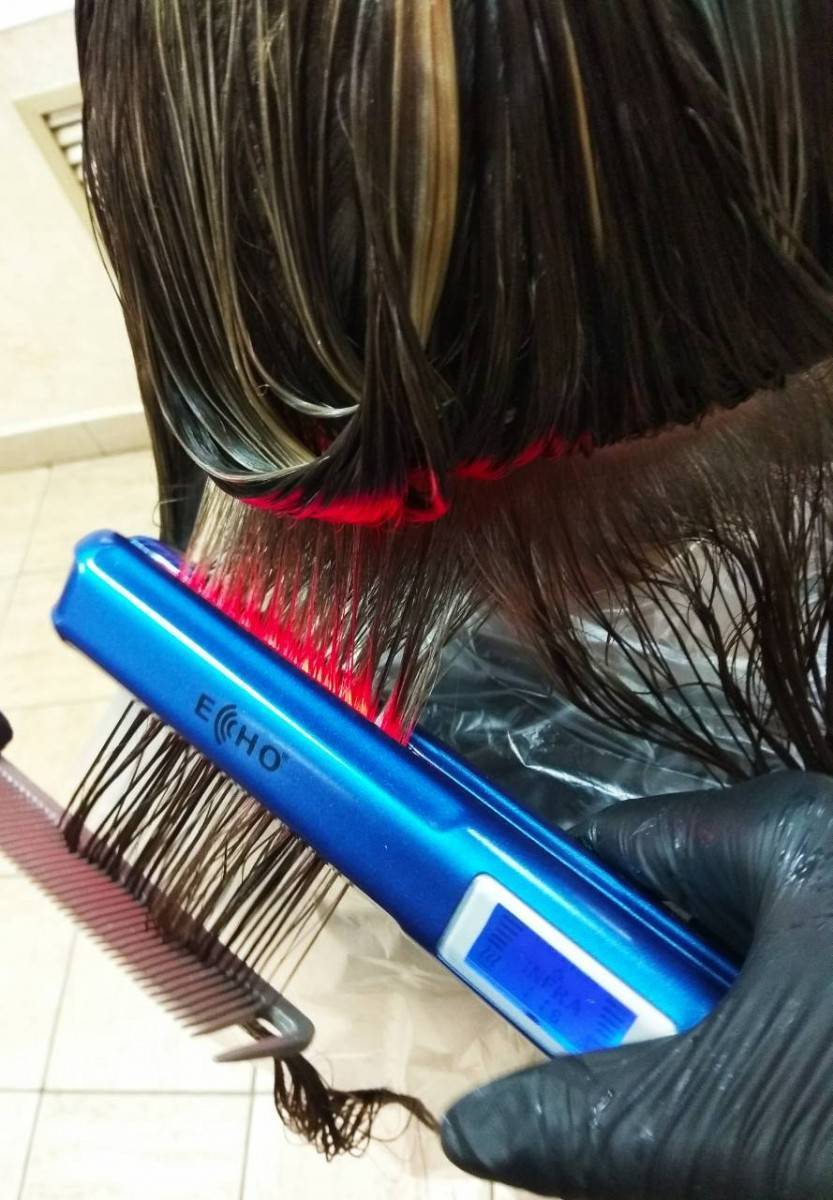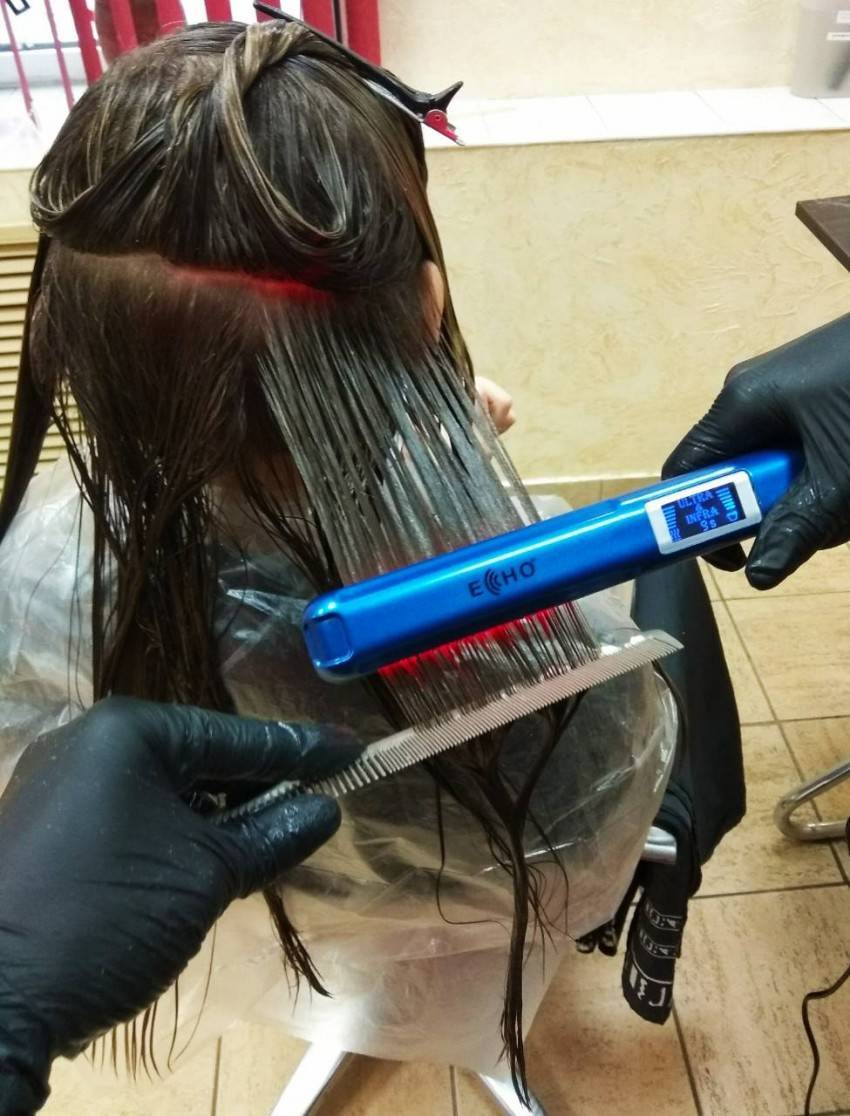 - Каждую прядь обрабатывают с помощью специального инфракрасного ультразвукового утюжка.