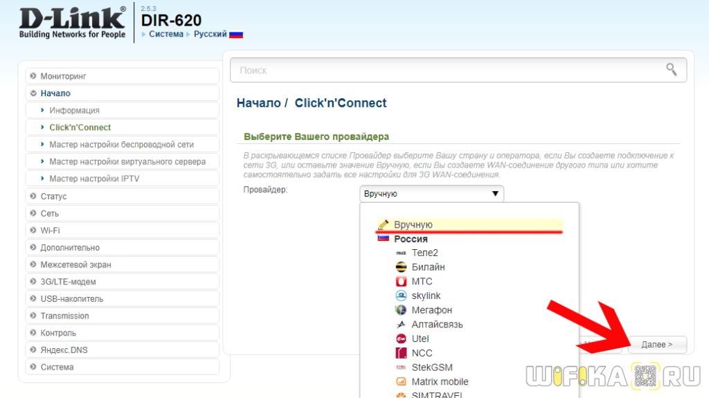 Далее нам следует выбрать провайдера — то есть поставщика интернет-услуг. В списке есть несколько стран СНГ и для каждой из них уже есть несколько вшитых настроек для провайдеров. Однако удивительно, но самых популярных в Москве не оказалось, поэтому оставляем здесь выбор на пункте «Вручную».