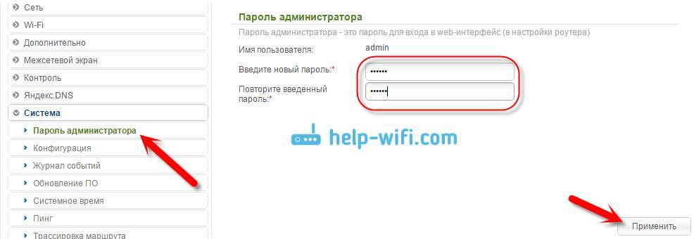Укажите два раза новый пароль и нажмите Применить. Не забудьте сохранить настройки.