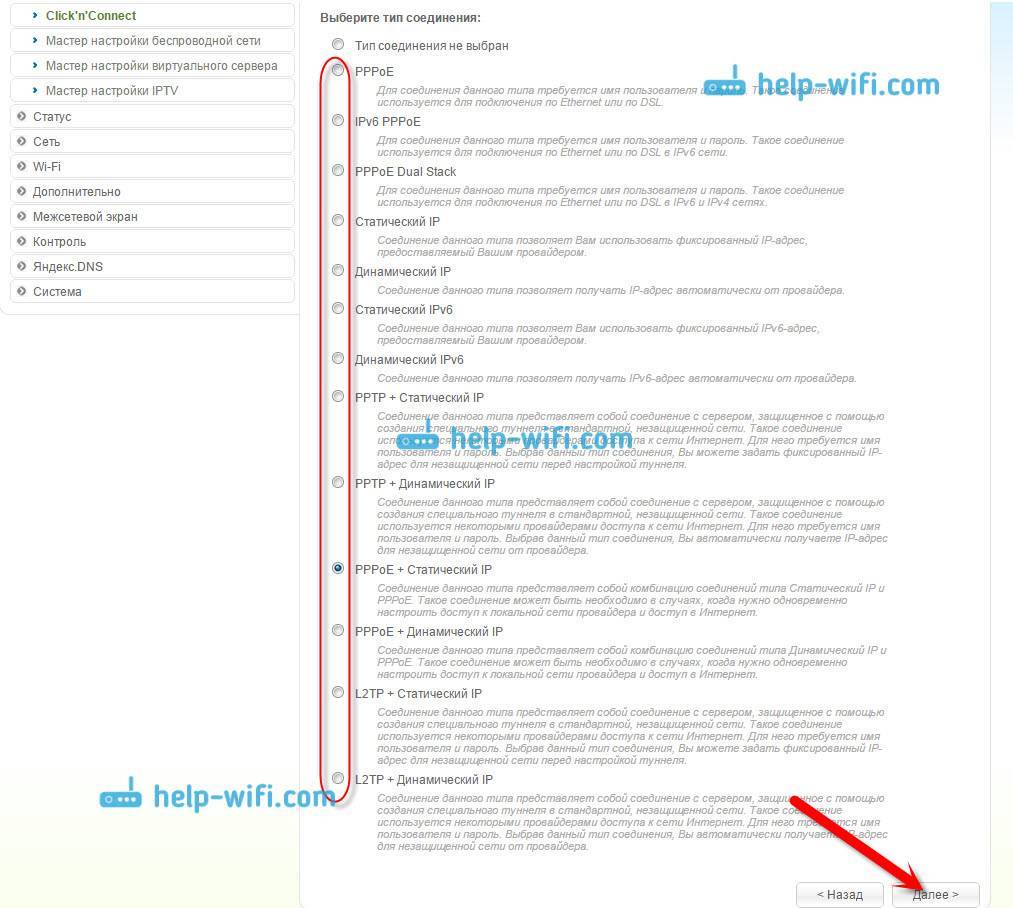 Выберите из списка ваше соединение. Если у вас например PPPoE и провайдер предоставляет еще и IP адрес, то выбираем PPPoE+Статический IP. Если IP нет, то выбираем просто PPPoE+Динамический IP. Или точно так же с L2TP.