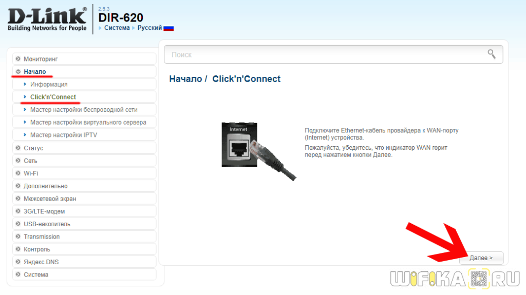 Основная навигация по конфигурациям расположено слева — в меню настроек нам надо найти пункт «Начало — Click’n’Connect». Тут за несколько шагов мы сможем быстренько настроить наш D-Link. Первое — «Подключите Ethernet-кабель провайдера к WAN-порту (Internet) устройства» — мы уже сделали