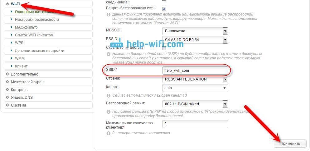 Перейдите на вкладку Wi-Fi – Основные настройки. Здесь мы будем менять имя нашего Wi-Fi. В поле SSID укажите название вашей сети. Нажмите кнопку Применить.