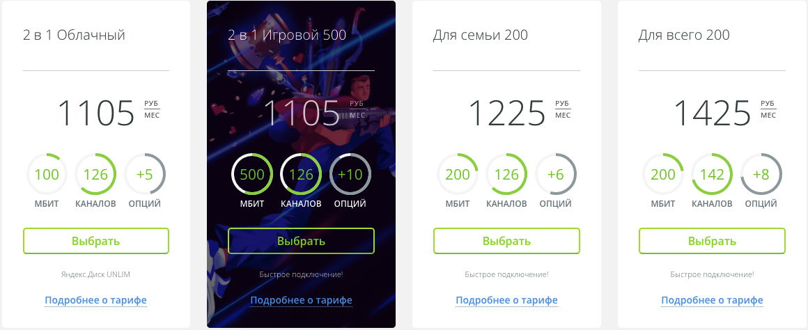 - 2 в 1 Обычный (1105 рублей). Параметры этого тарифа включают только 126 каналов ТВ и 100 мб интернета. Однако в дополнении предлагается возможность воспользоваться антивирусом в течение 30 дней бесплатно или использовать Яндекс. Диск безлимитно.